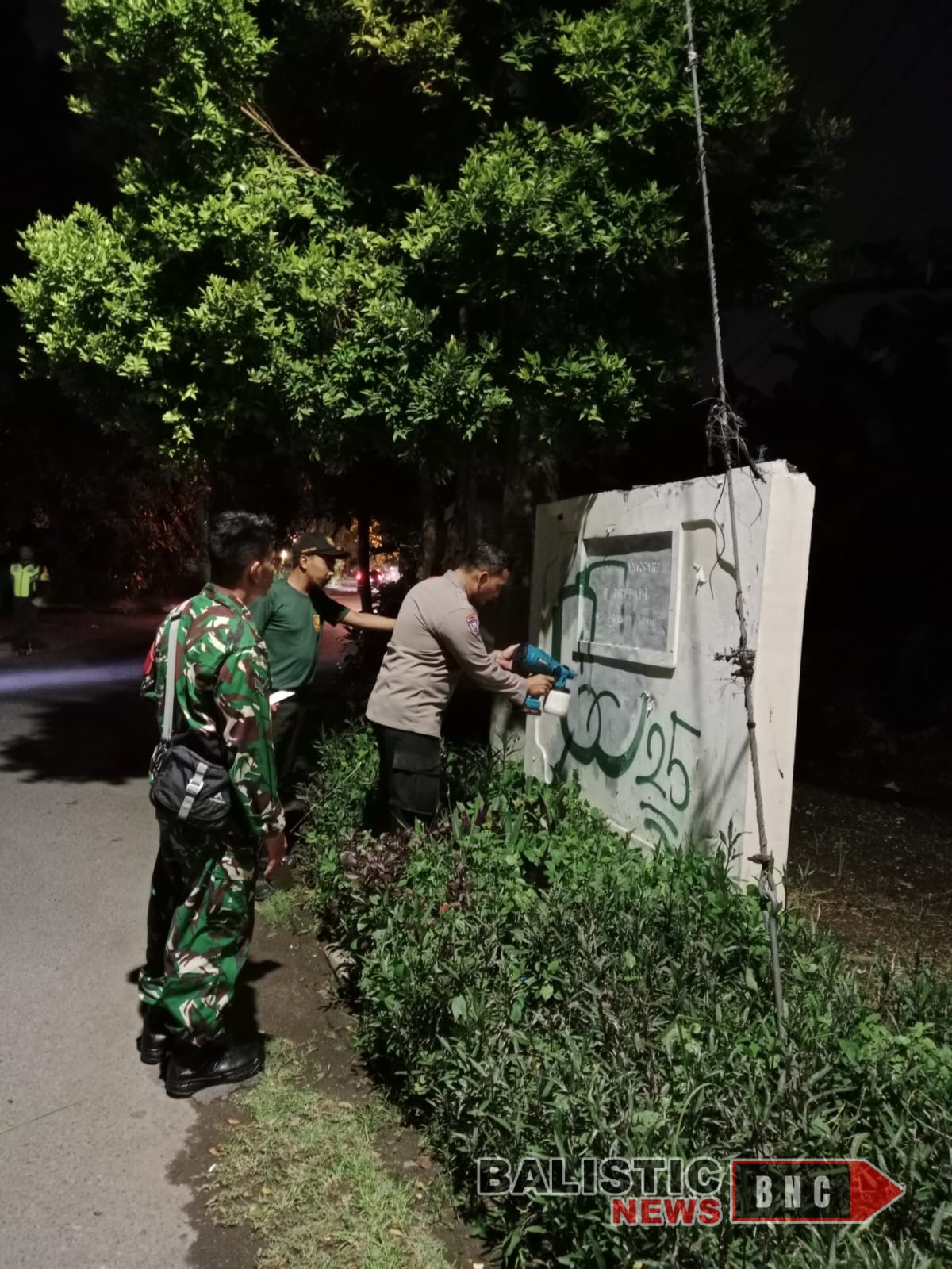 Balisticnews.com Bhabinkamtibmas Desa Sumerta Kelod Aipda I Kadek Rudi Martana, S.H., bersama Babinsa Sertu I Gede Mega dan personel Linmas Deda Sumerta Kelod kembali melakukan pembersihan coretan vandalisme yang muncul di Jalan Drupadi, Kamis (27/11/2025) malam.