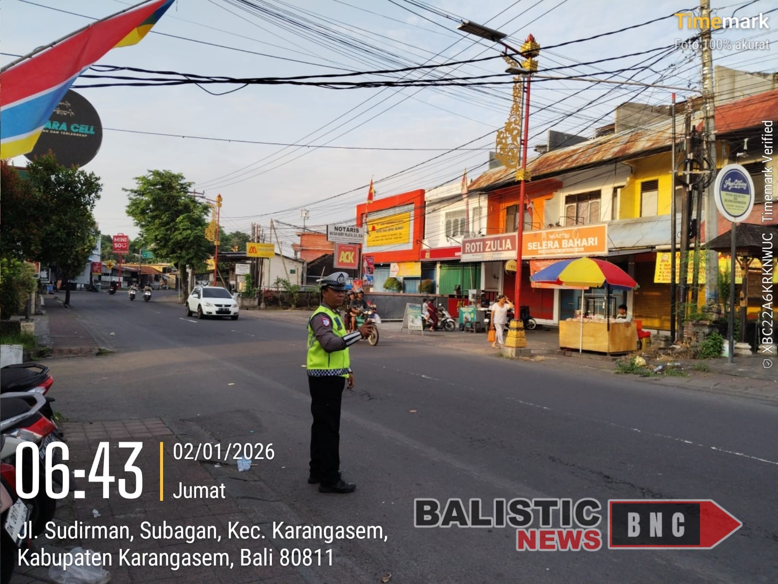 Polda Bali – Polres Karangasem – Satuan Lalu Lintas – Pada hari Jumat, 2 Januari 2026 sekira pukul 06.44 Wita demi menjaga keamanan dan kelancaran arus lalu lintas di BTN Taman Asri, personil satuan Lalu Lintas Polres Karangasem yang sudah disprinkan bertugas gatur pagi, tetap dengan semangat dan ikhlas serta berbekal rasa tanggungjawab tinggi melaksanakan tugas pemantauan, pengaturan dan penjagaan arus lalu lintas serta dapat membantu menyeberangkan masyarakat pengguna jalan yang melintas di seputaran terutama pada jam – jam padat arus lalu lintas di pagi hari pada jalan masuk sp. 3 BTN Taman Asri Amlapura.
