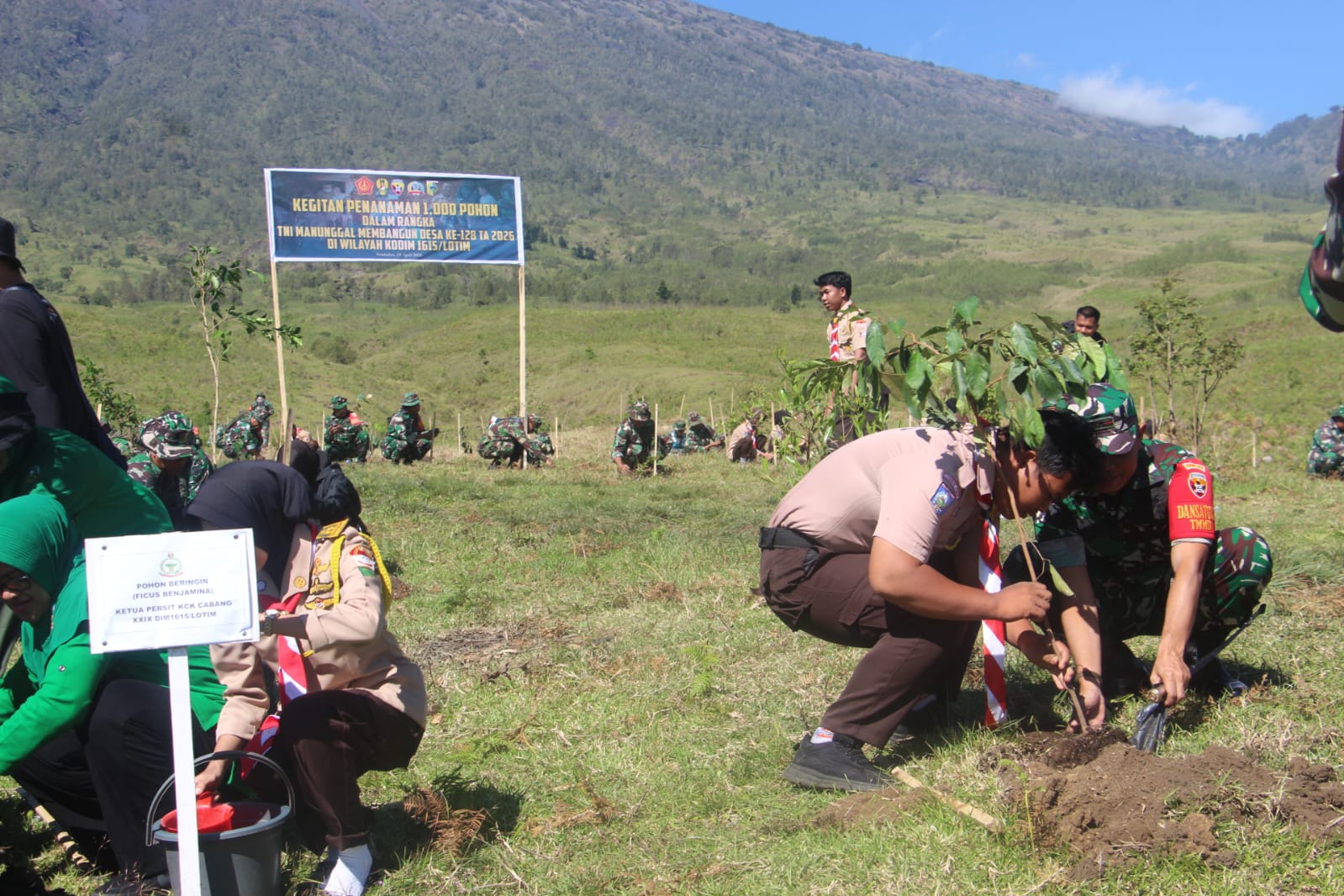 Lombok Timur – Dalam rangka mendukung pelestarian lingkungan sekaligus menyukseskan program TNI Manunggal Membangun Desa (TMMD) ke-128, Kodim 1615/Lombok Timur melaksanakan kegiatan penanaman 1.000 pohon di lahan seluas 5.000 meter persegi (½ hektare), Jumat (24/04/2026).