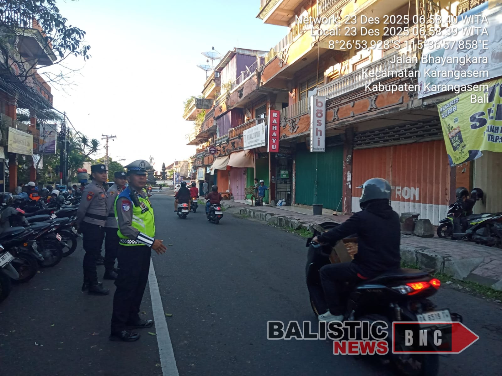 Ops Nataru 2025, Anggota Polres Karangasem Laksanakan Tugas Menyebrangkan Pejalan Kaki di Pasar Kesatriaan Amlapura