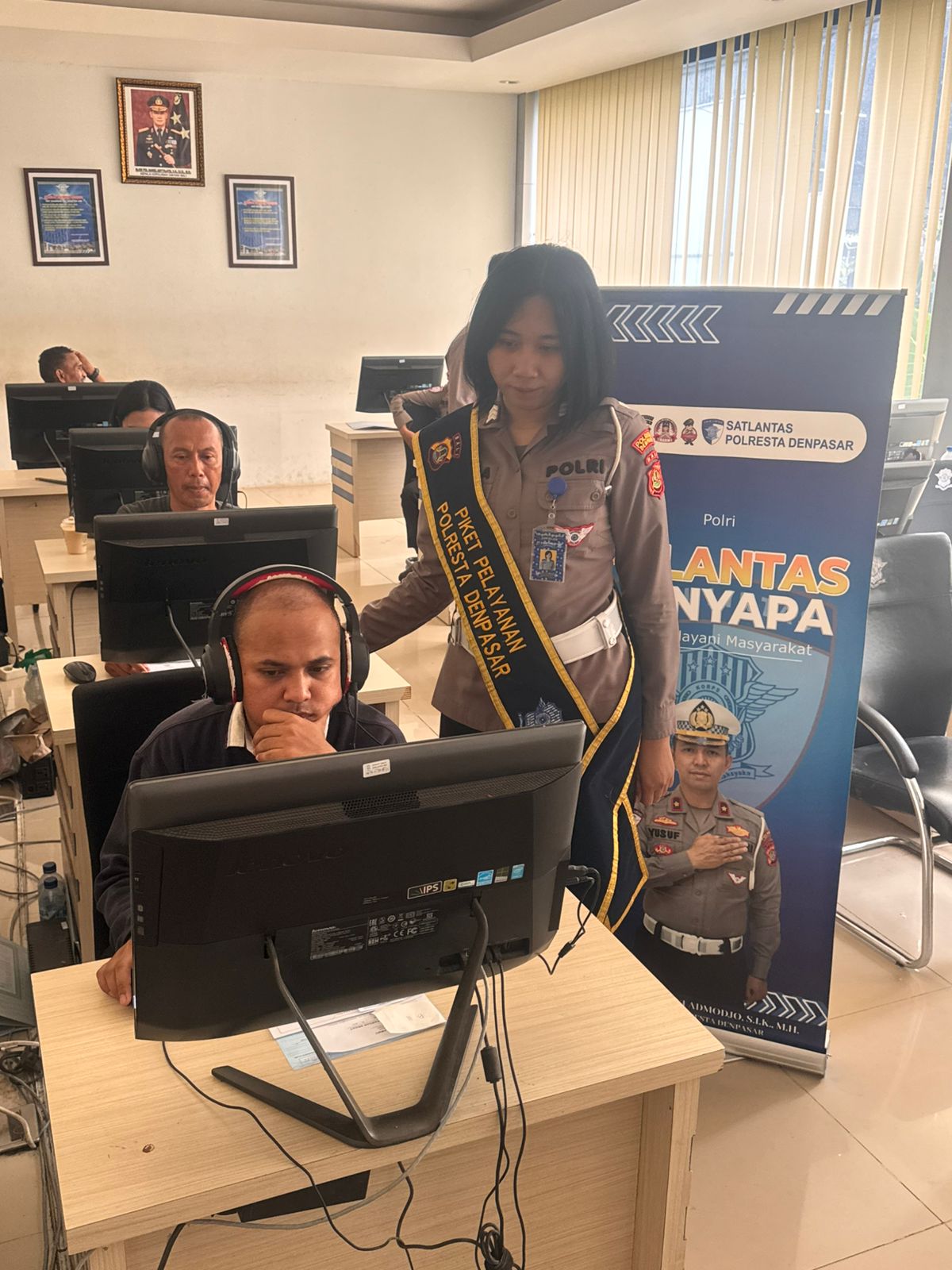 Denpasar – Suasana pelayanan di Satpas SIM Satlantas Polresta Denpasar tampak tertib dan kondusif. Sejumlah pemohon SIM terlihat mengikuti tahapan ujian teori berbasis komputer dengan serius, didampingi langsung oleh petugas yang sigap memberikan arahan.