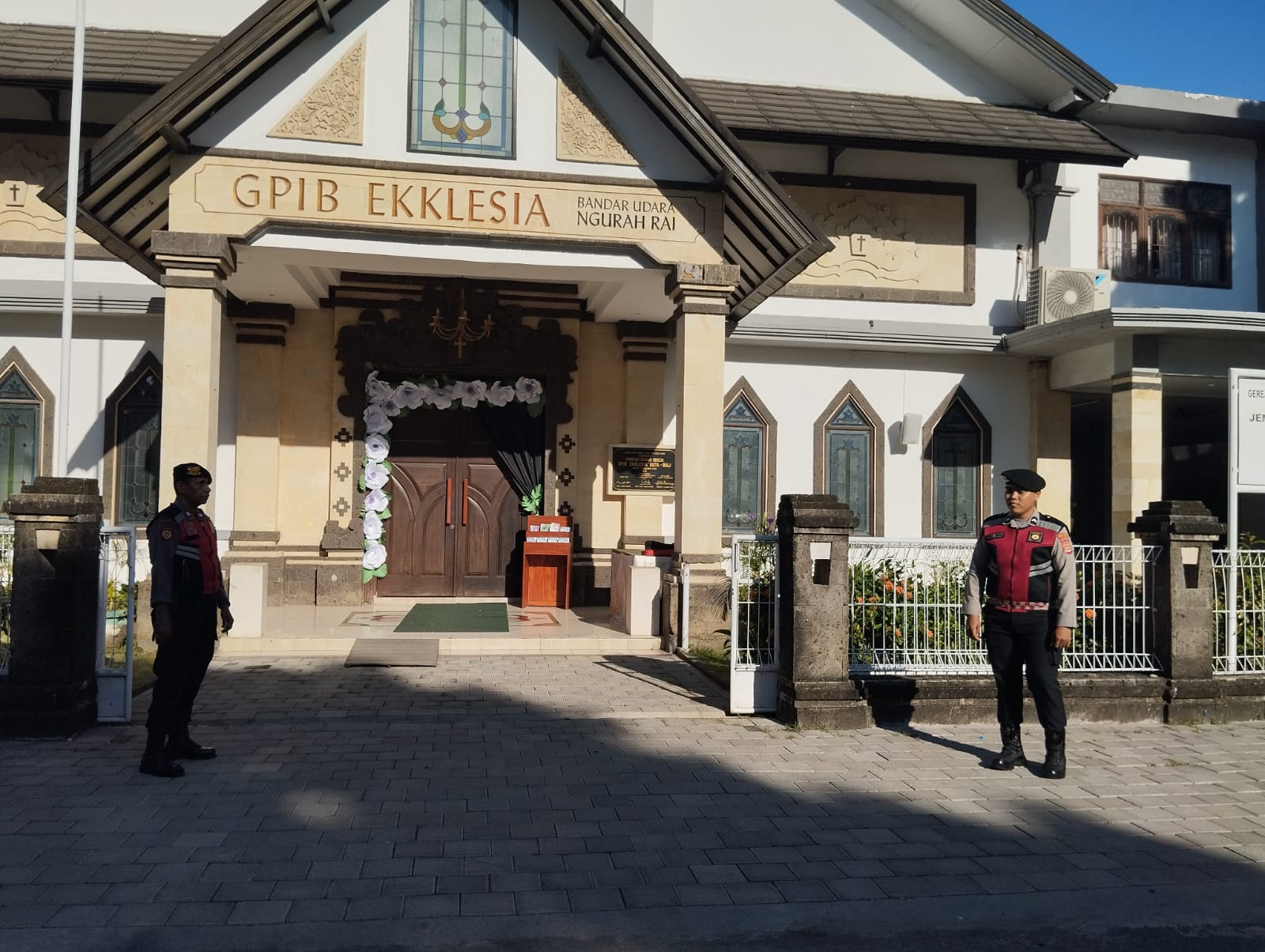 Badung – Personel Polres Kawasan Bandara I Gusti Ngurah Rai melaksanakan pengamanan kegiatan ibadah Minggu di Gereja Ekklesia, Badung, Bali, Minggu (12/4/2026). Pengamanan dilakukan untuk memastikan umat Kristiani dapat beribadah dengan aman dan nyaman.