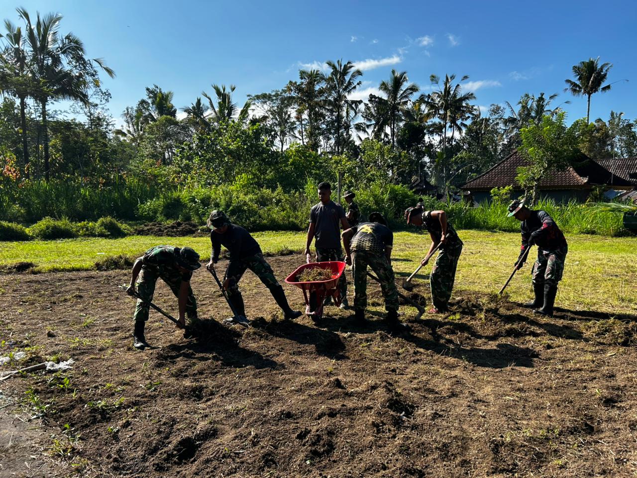 Karangasem – Guna mempererat kemanunggalan TNI – Rakyat, Satgas TMMD ke – 128 Kodim 1623/Karangasem melaksanakan pembuatan lapangan voli bertempat di Dusn Kubakal, Desa Pempatan, Kec.Rendang, Kab.Karangasem pada Senin (27/04/26)