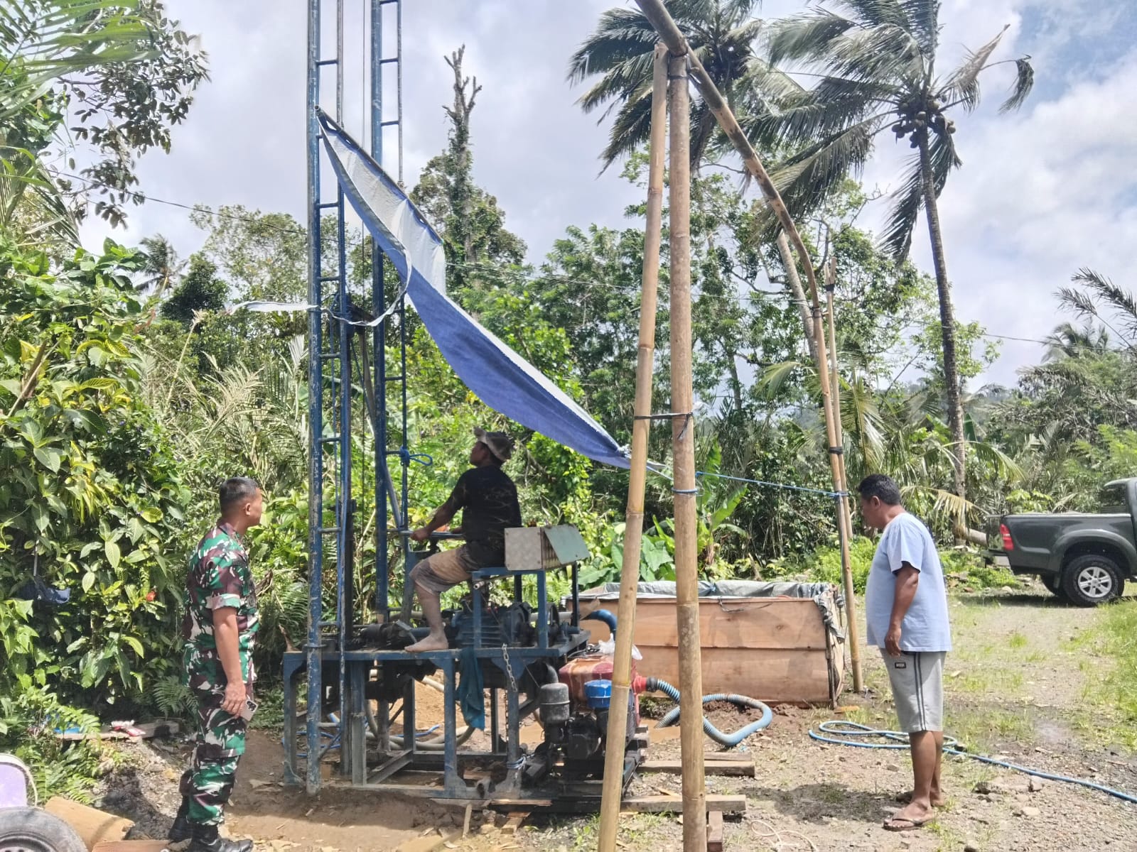 “Hari pertama pengeboran sumur baru mencapai kedalaman 5 meter dari prediksi kedalaaman 100 meter yang direncanakan, mudah – mudahan pengeboran sumur ini bisa berjalan lancar agar secepatnya bisa dinikmati oleh Masyarakat” tutupnya