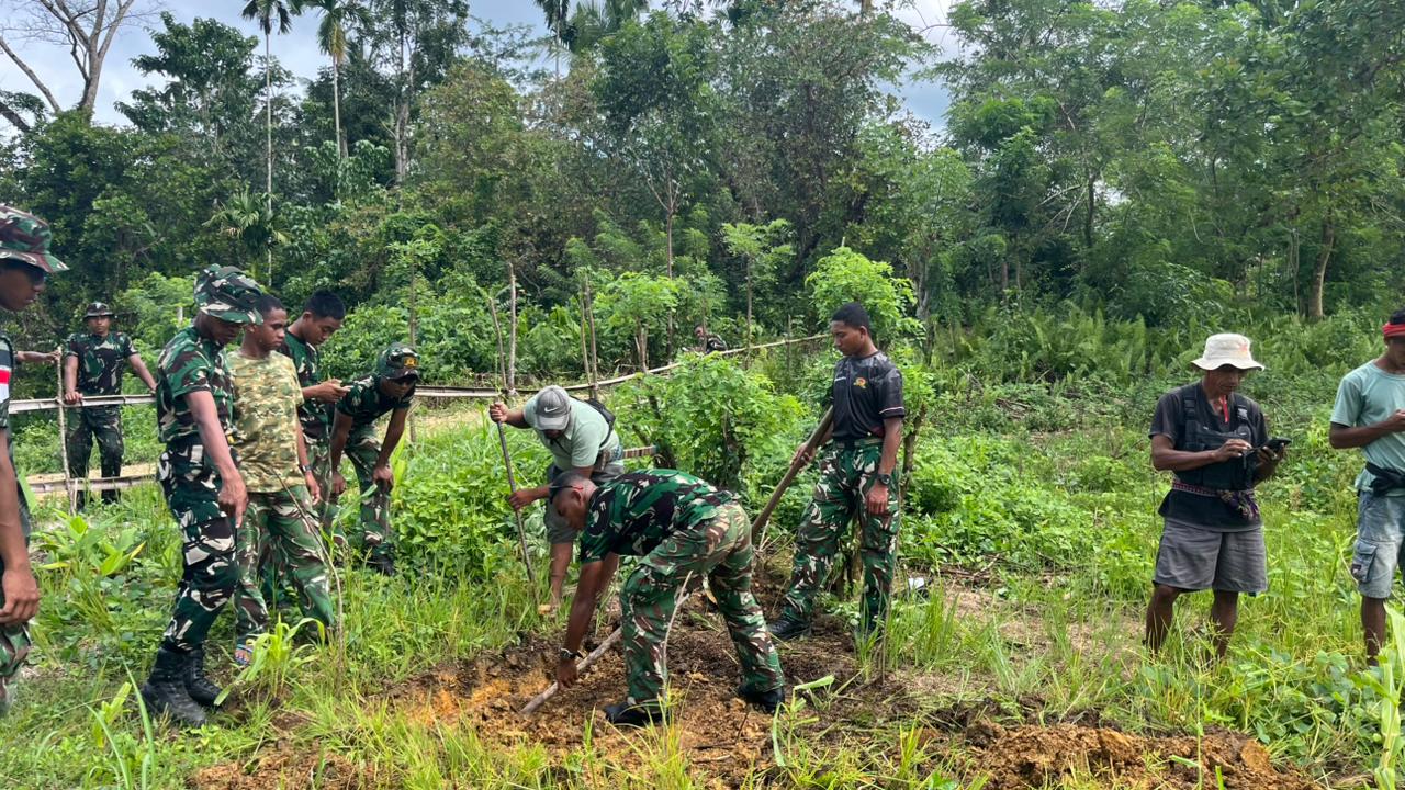 Pengerjaan dilakukan secara bertahap dengan memanfaatkan peralatan sederhana, namun tidak menyurutkan semangat anggota Satgas dan warga setempat.