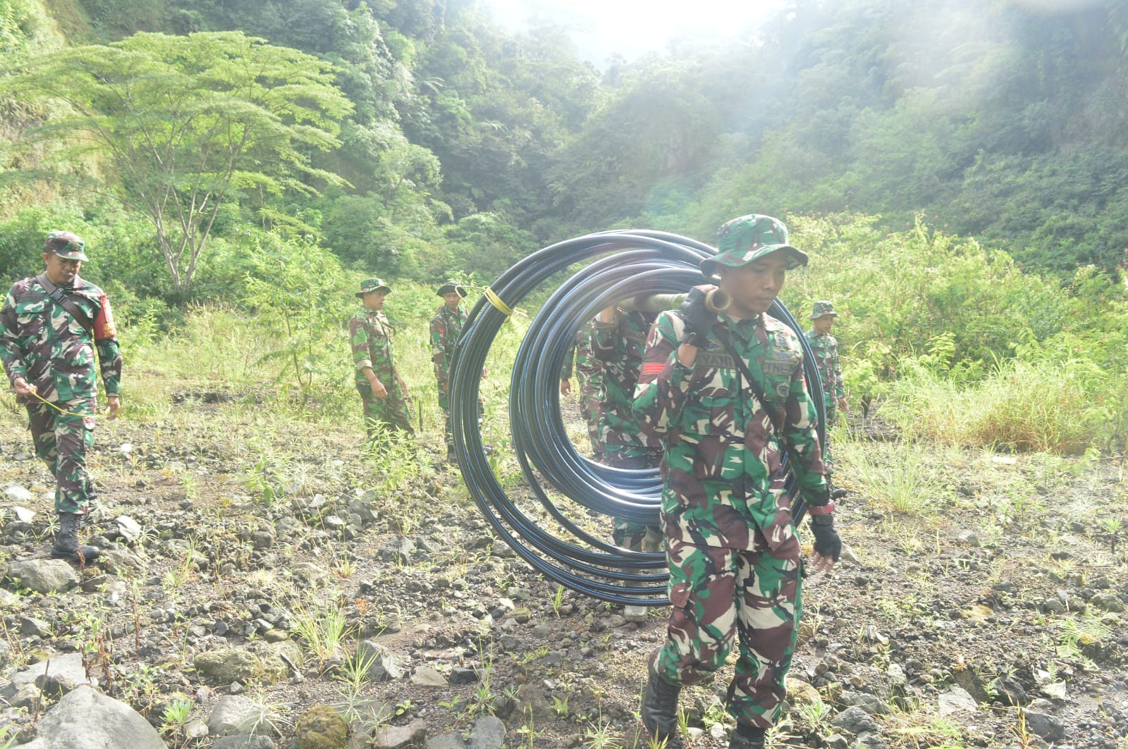 Kegiatan diawali dengan proses droping pipa ke lokasi proyek, dilanjutkan dengan pembentangan jaringan pipa dari bak resevoar. Proyek pipanisasi ini merupakan salah satu sasaran non fisik dalam program TMMD, yang diharapkan mampu menjawab kebutuhan dasar masyarakat akan akses air bersih.