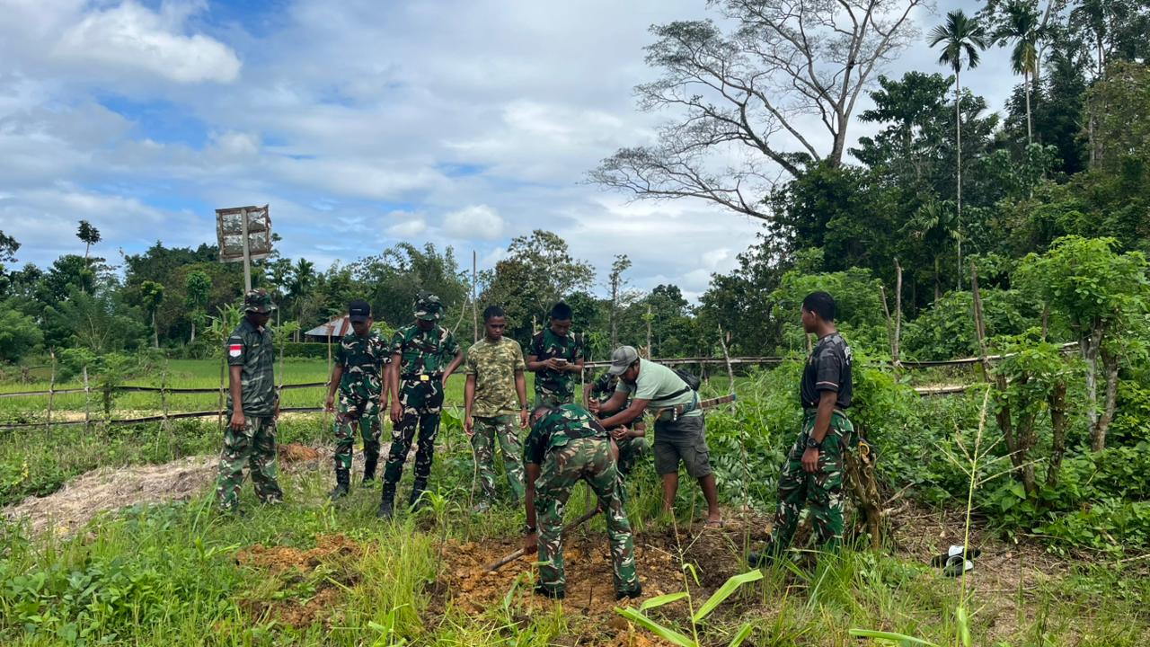 Pengerjaan dilakukan secara bertahap dengan memanfaatkan peralatan sederhana, namun tidak menyurutkan semangat anggota Satgas dan warga setempat.