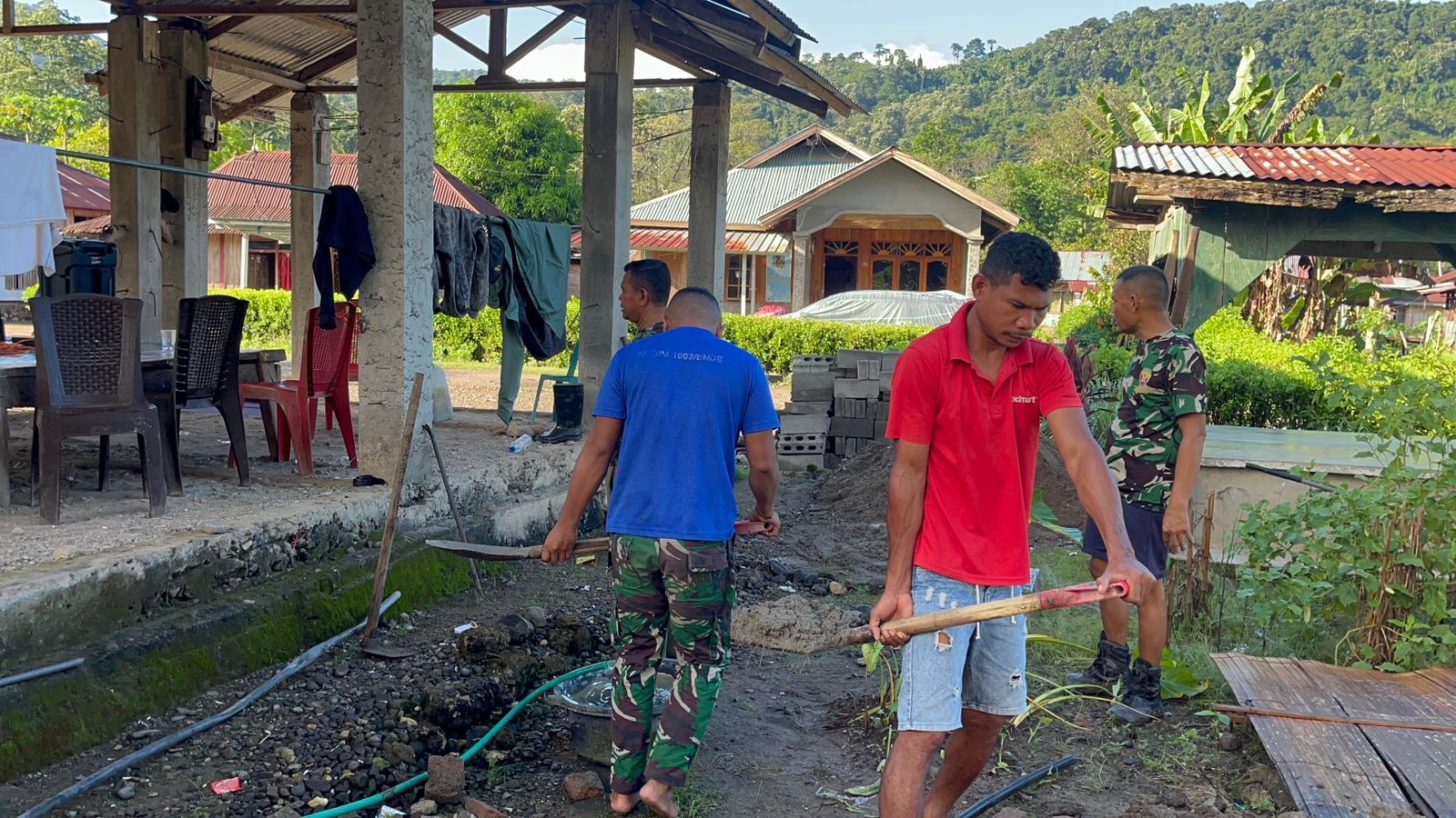 Kebersamaan antara TNI dan warga begitu terasa di lokasi pekerjaan. Tanpa mengenal lelah, mereka saling membantu demi percepatan pembangunan. Suasana gotong royong yang tercipta menjadi bukti kuat kemanunggalan TNI dengan rakyat.