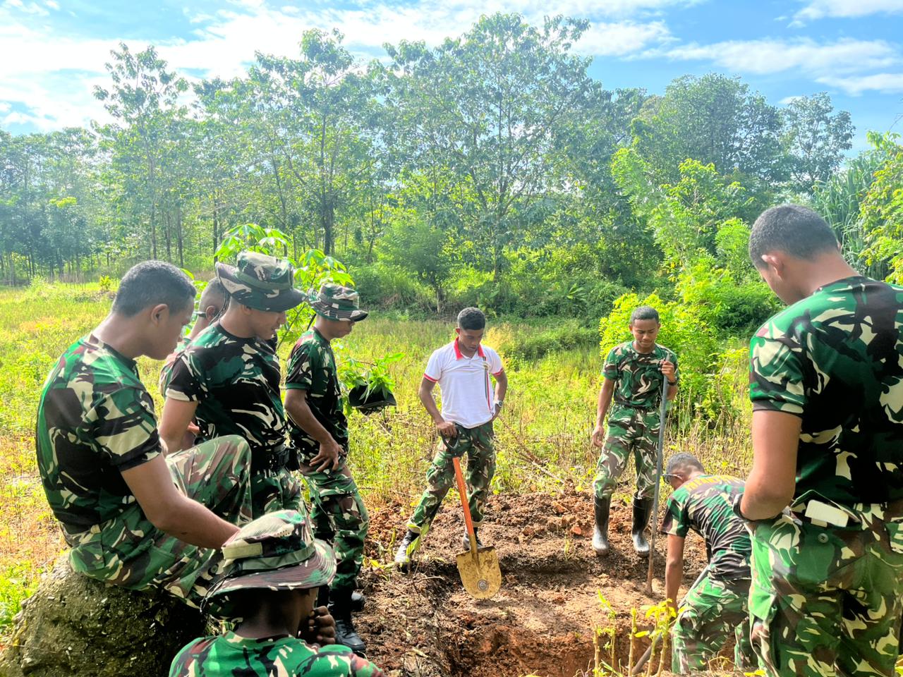 Kegiatan ini merupakan bagian dari upaya TNI dalam meningkatkan kualitas sanitasi dan kesehatan masyarakat di wilayah pedesaan. Dengan penuh semangat, anggota Satgas bersama warga setempat bahu-membahu melakukan penggalian lubang sebagai dasar pembangunan fasilitas MCK yang layak dan higienis.