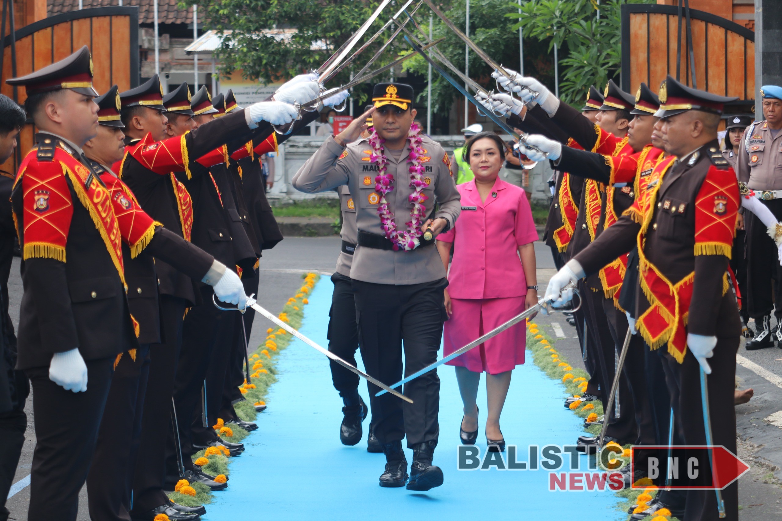 Begitu tiba di gerbang Mapolres, AKBP I Made Santika disambut oleh barisan perwira yang membentuk gerbang pora dengan pedang terhunus. Langkah kaki Kapolres baru diiringi dengan penghormatan sebagai simbol kesiapan seluruh personel untuk bekerja di bawah kepemimpinan beliau.