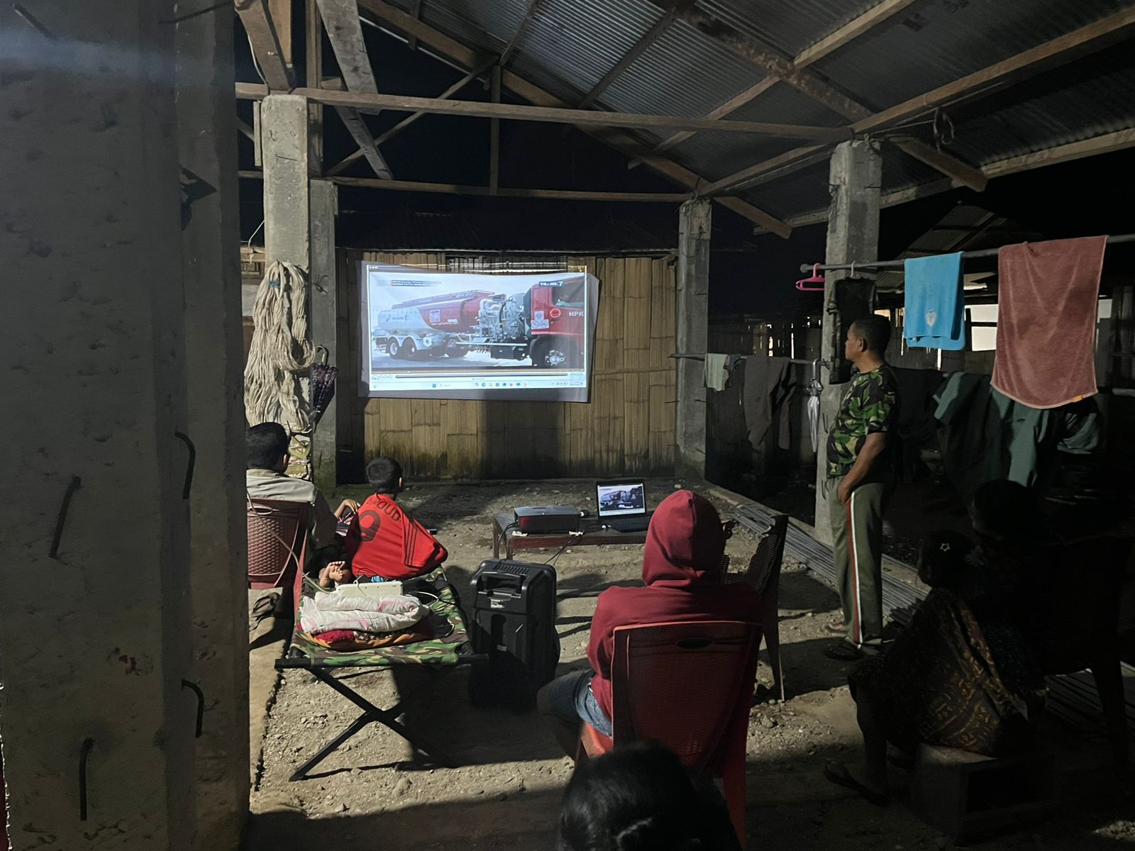 Kegiatan nobar yang dilaksanakan usai aktivitas pembangunan ini menjadi sarana hiburan bagi anggota Satgas dan masyarakat setempat. Di bawah suasana malam yang tenang, warga dari berbagai kalangan berkumpul dan menikmati tontonan bersama dengan penuh keakraban.