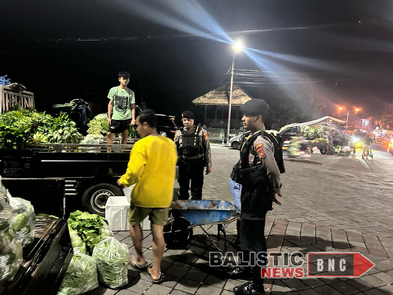 Patroli dilakukan secara humanis oleh empat personel Raimas berseragam lengkap dengan kendaraan operasional yakni Aipda I Nyoman Yasa, Bripda I Nyoman Sudiana, Bripda I Made Yuda Warsa Dan Bripda I Komang Pippo Bintang Seputra, menyasar titik-titik keramaian di dalam area pasar, tempat parkir, serta jalur akses keluar-masuk kendaraan distribusi barang. Kehadiran polisi pada jam rawan ini disambut antusias para pedagang maupun pembeli.