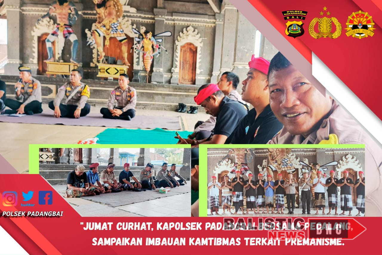 Balisticnews.com Polda Bali –Polres Karangasem –Polsek Kawasan Pelabuhan Padangbai – Dalam rangka menjaga kondusifitas wilayah, Kapolsek Padangbai Kompol I Nyoman Merta Kariana, S. H.,M. H, melaksanakan kegiatan Jumat Curhat bersama para Pecalang di wilayah Desa Padangbai, Jumat (16/5).