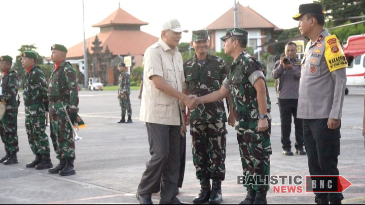 Badung – Pangdam IX/Udayana, Mayjen TNI Muhammad Zamroni, S.IP., M.SI., bersama Gub. Bali I Wayan Koster dan wakapolda Bali menyambut kedatangan Menteri Pertahanan Republik Indonesia, Letjen (Purn) Sjafrie Sjamsoeddin, di Base Ops Lanud I Gusti Ngurah Rai, Kuta, Kabupaten Badung, pada Jumat, 4 April 2025.