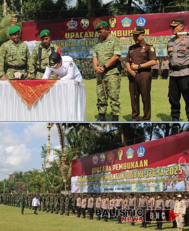 BALI – Badung, balisticnews.com – Dalam rangka Upacara Pembukaan TNI Manunggal Membangun Desa (TMMD) Ke-126 di wilayah Kodim 1611/Badung, digelar di Lapangan Desa Taman, Kecamatan Abiansemal, Kabupaten Badung, pada hari Rabu, 8 Oktober 2025. Kegiatan ini dibuka secara resmi oleh Bupati Badung, I Wayan Adi Arnawa, dan dihadiri oleh sekitar 200 orang.