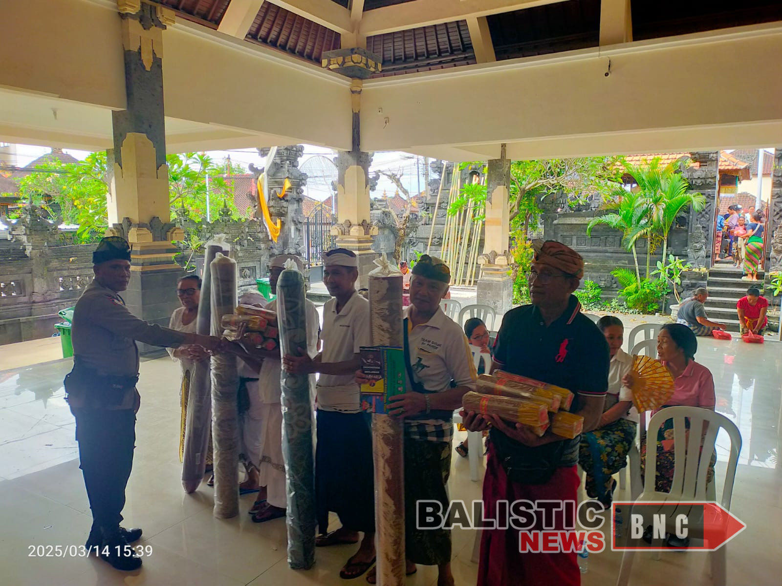 Adapun bantuan yang diserahkan meliputi karpet, dupa, senter lalu lintas, borgol, peluit, serta perlengkapan sarana sembahyang. Penyerahan dilakukan langsung oleh Kanit Binmas AKP I Wayan Suwita, S.H., beserta beberapa personel Polsek Kuta Selatan.