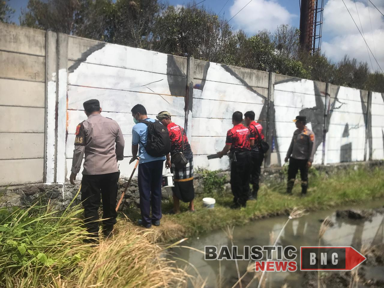 Kapolsek Dentim Kompol I Ketut Tomiyasa, S.H., M.H., bersama Kanit Binmas AKP I Nyoman Sujana, S.H., dan Kanit Intelkam Iptu I Nyoman Hendra beserta anggota Polsek Dentim turun langsung melakukan pembersihan dengan mengecat ulang tembok yang tercoret.