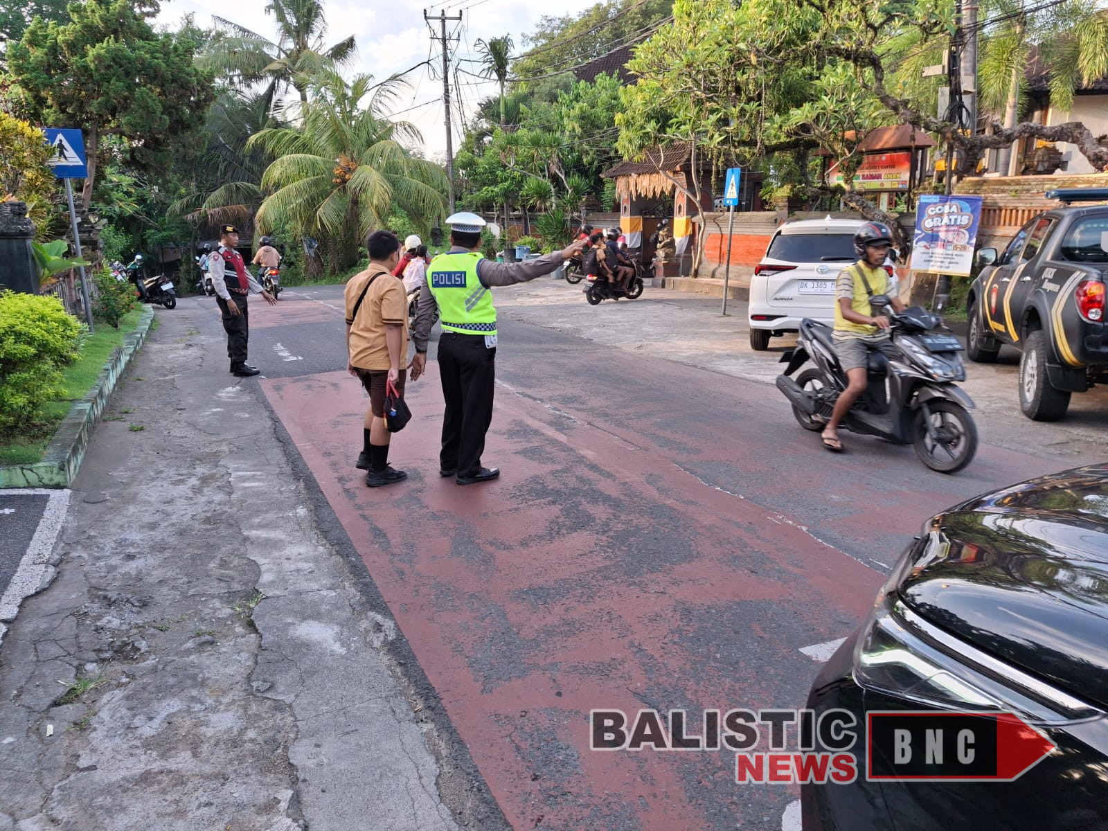 Gianyar, balisticnews.com – Dalam rangka mendukung kelancaran pelaksanaan pembelajaran tatap muka serta memberikan rasa aman kepada siswa yang berangkat ke sekolah, Polsek Gianyar melaksanakan pengamanan dan pengaturan arus lalu lintas di depan SMA Negeri 1 Gianyar dan SD Negeri 2 Gianyar pada Sabtu (8/3).